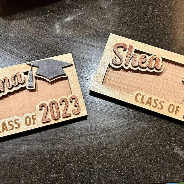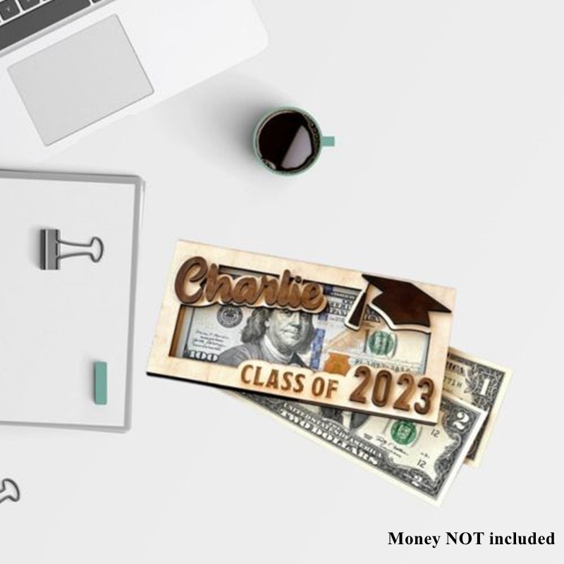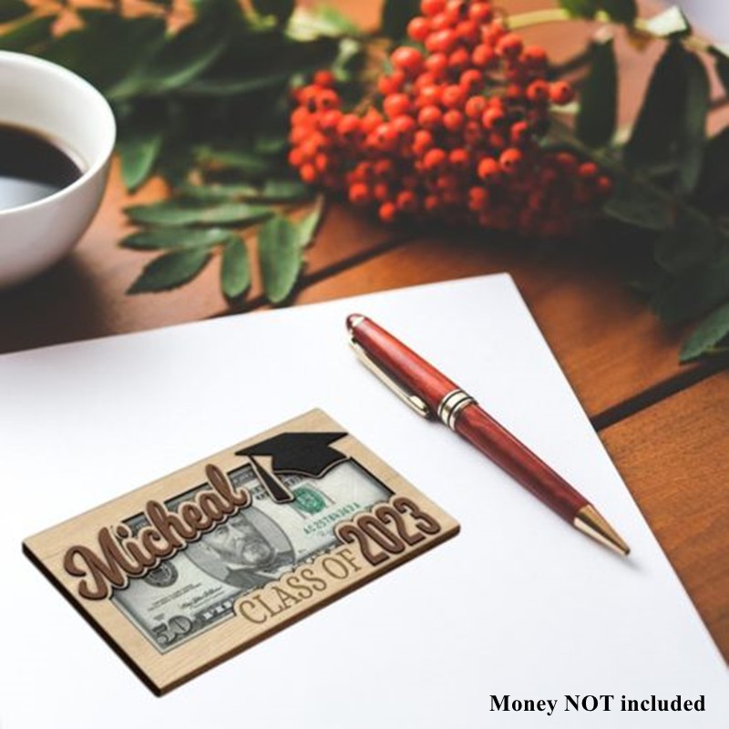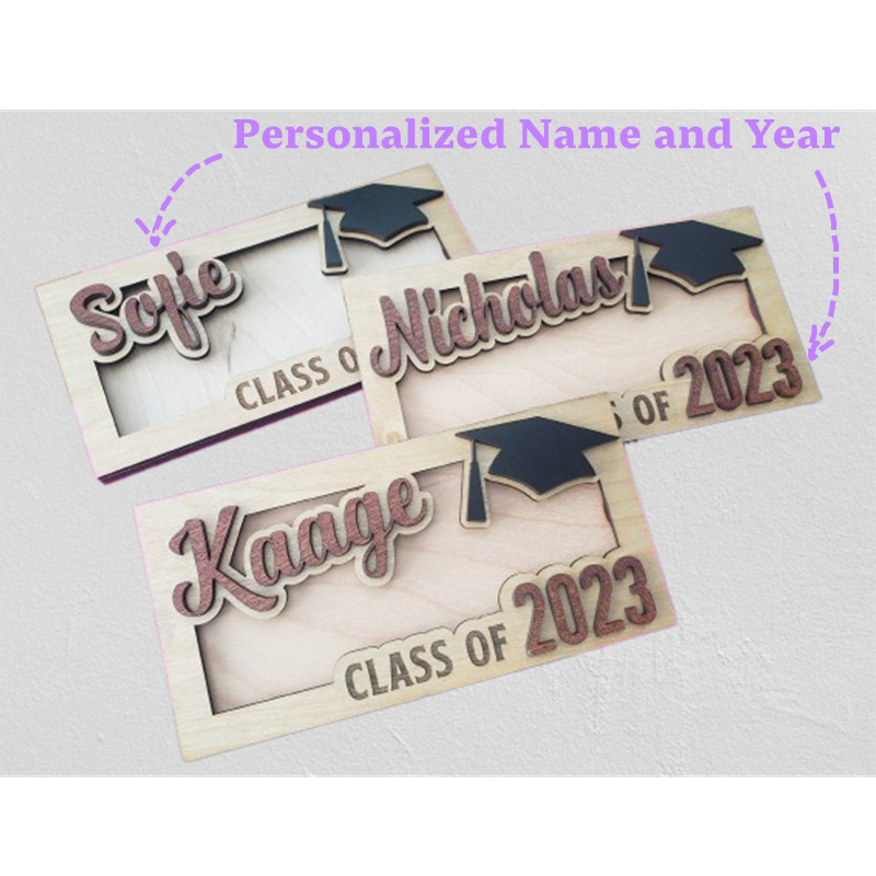 This unique graduation money holder is the perfect alternative to a graduation greeting card. Featuring a personalized name, Black graduation cap and the year 2023. Money easily slides into between 2 pieces of wood.