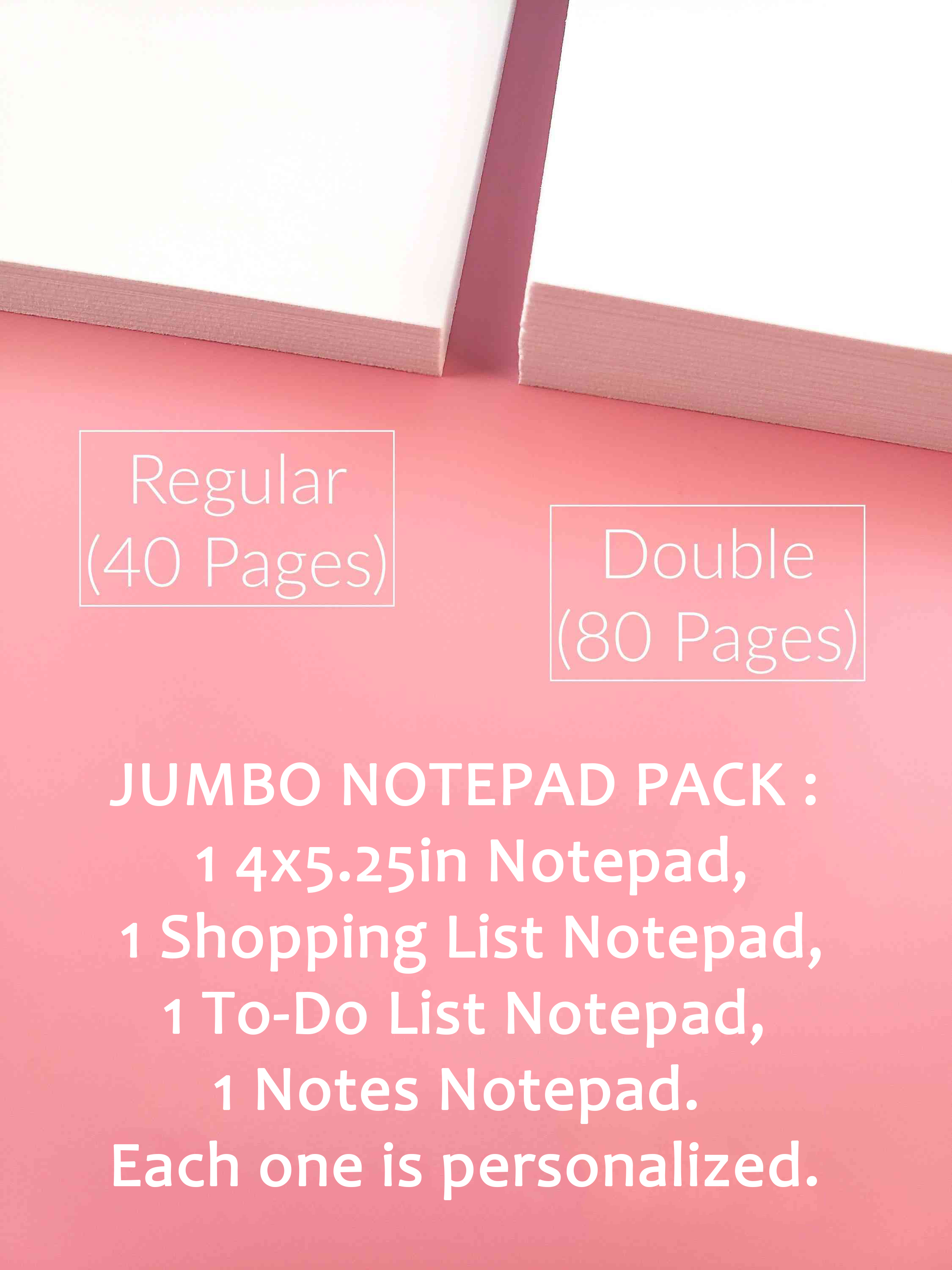 JUMBO NOTEPAD PACK | 1 4x5.25in Notepad, 1 Shopping List Notepad, 1 To-Do List Notepad, and 1 Notes Notepad. Each one is personalized.