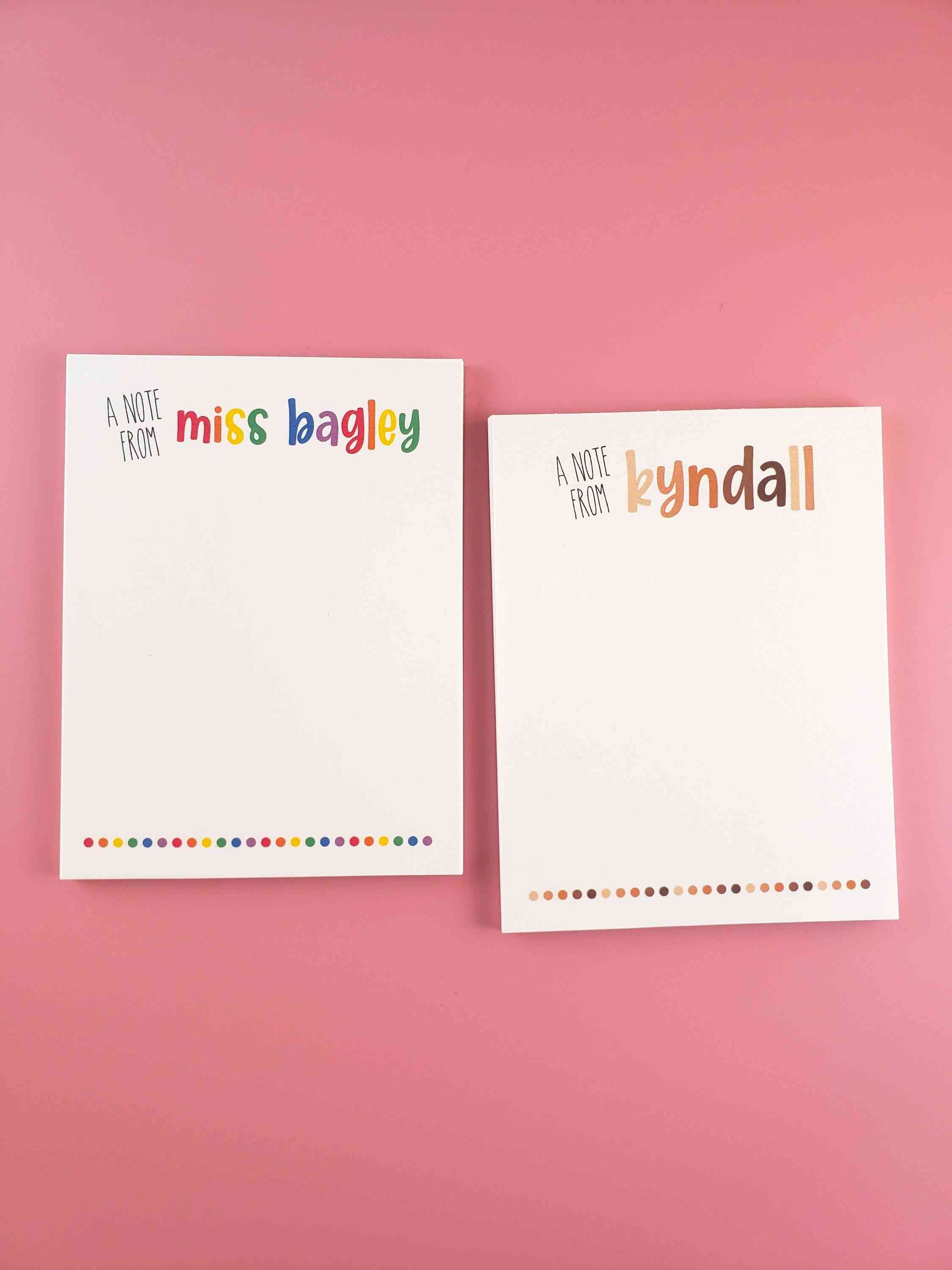These notepads are perfect-bound each with 40 sheets of high quality 24lb paper. They're approximately 4x5.25 inches. These would be perfect for your office, fridge or a gift! These notepads can be personalized with your name.
